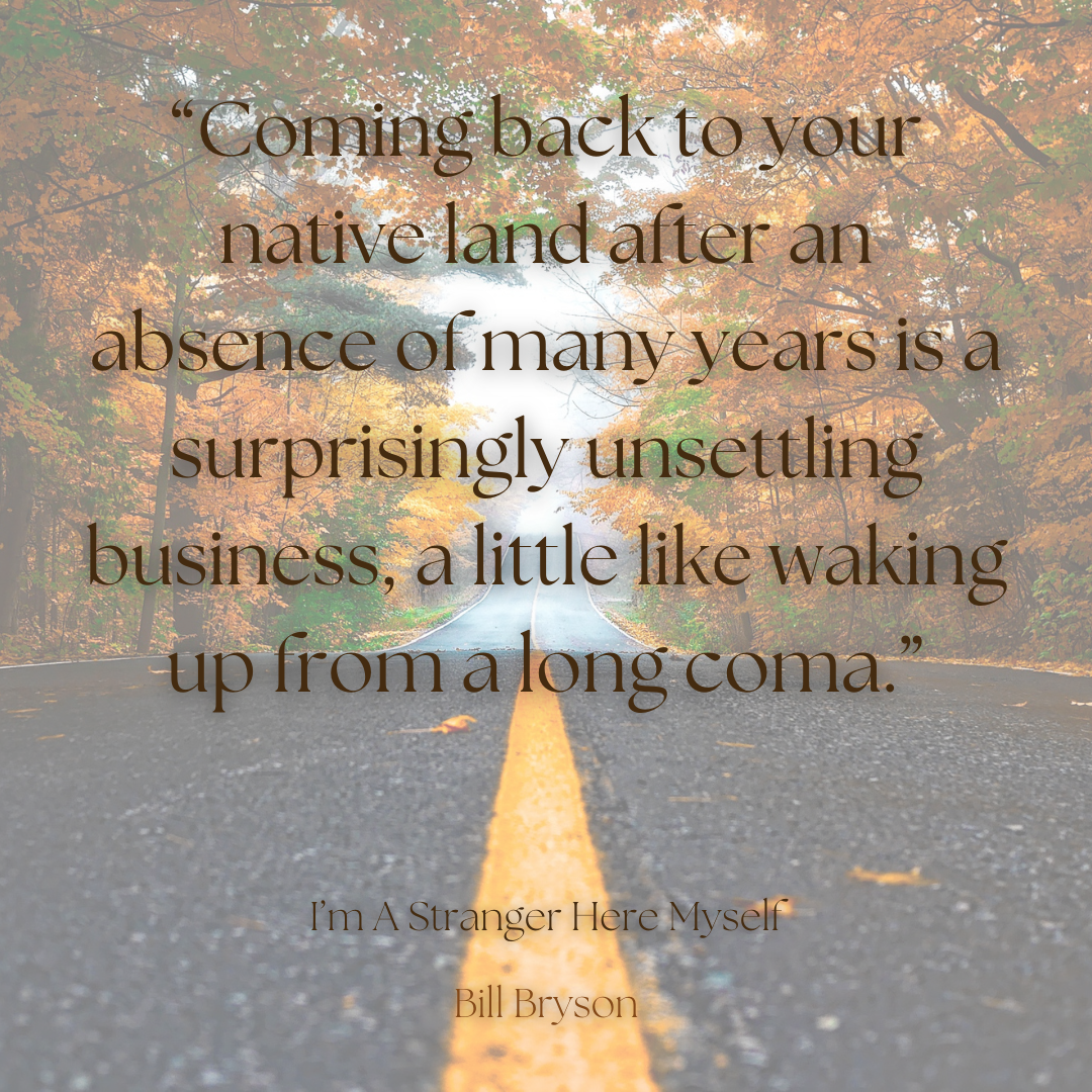 I do believe Bryson moved back to the United Kingdom, and he's produced more books in the meantime. As I mentioned, his book At Home was one of my favorite reads. He's witty, has a lovely shade of snark, is ready to make fun of himself as well as situations he finds himself in, isn't mean or nasty in any critique, and has an easy prose.