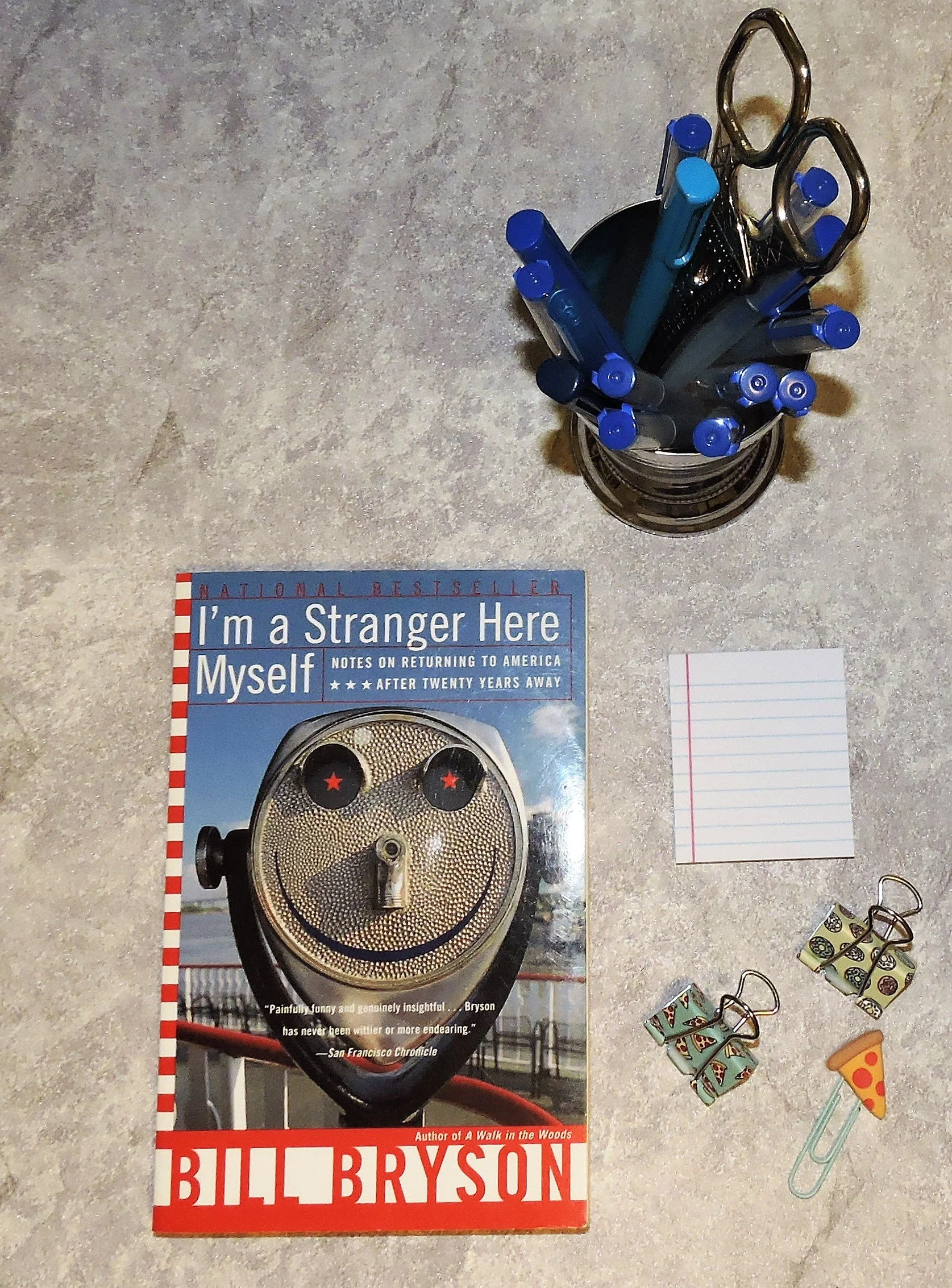 I'm A Stranger Here Myself details the Bryson family's return (or moving) to America after two decades of living in England. Bill Bryson wrote essays for his newspaper back home, which were later turned into a book. It's an observant view of the mundane, the exciting, the ridiculous, and the beloved aspects of life here. I cannot adore this book more.